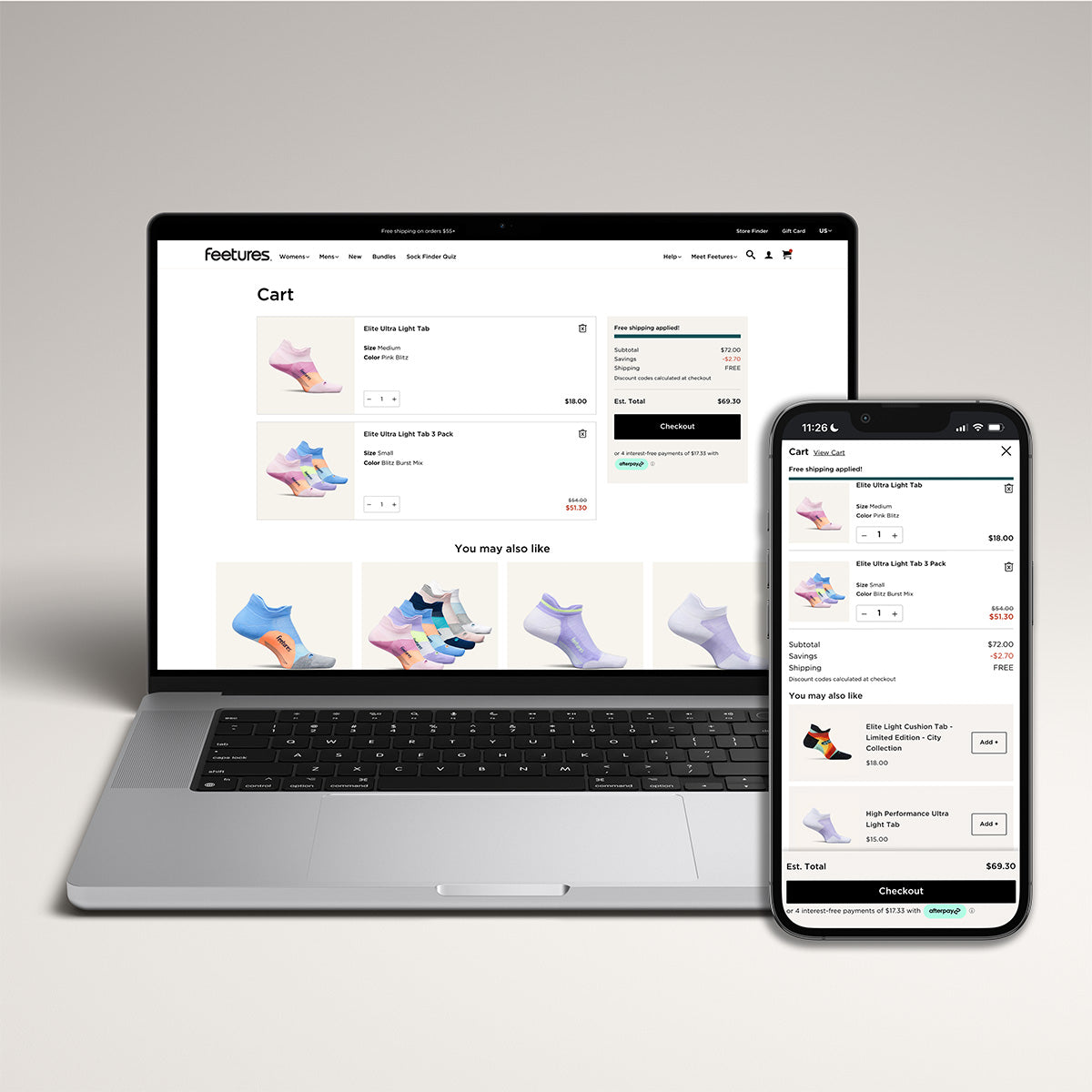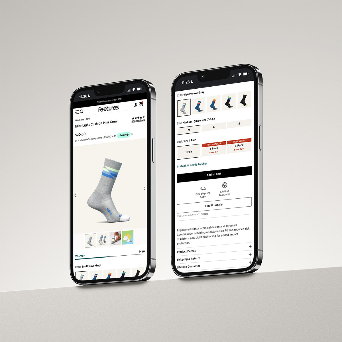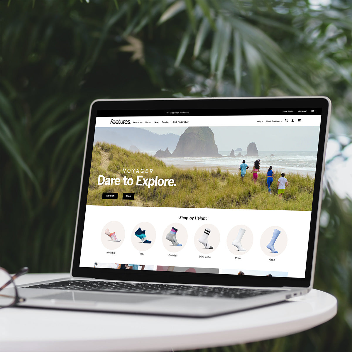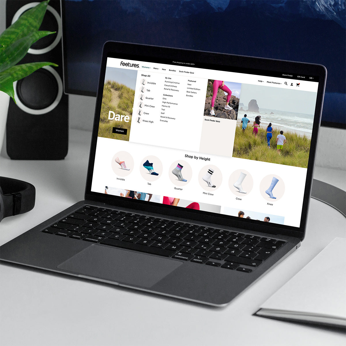 Feetures sells the best running socks on the planet (we're not biasaed, you are!). In 2020, as home workouts exploded in popularity in response to the pandemic, the Feetures team, located in the Raleigh, NC area, wanted to elevate their online shopping experience with a fully custom website redesign. Their business had grown on their old theme, but they needed a more dynamic site that was made for their highly technical socks while providing a top-tier brand experience.