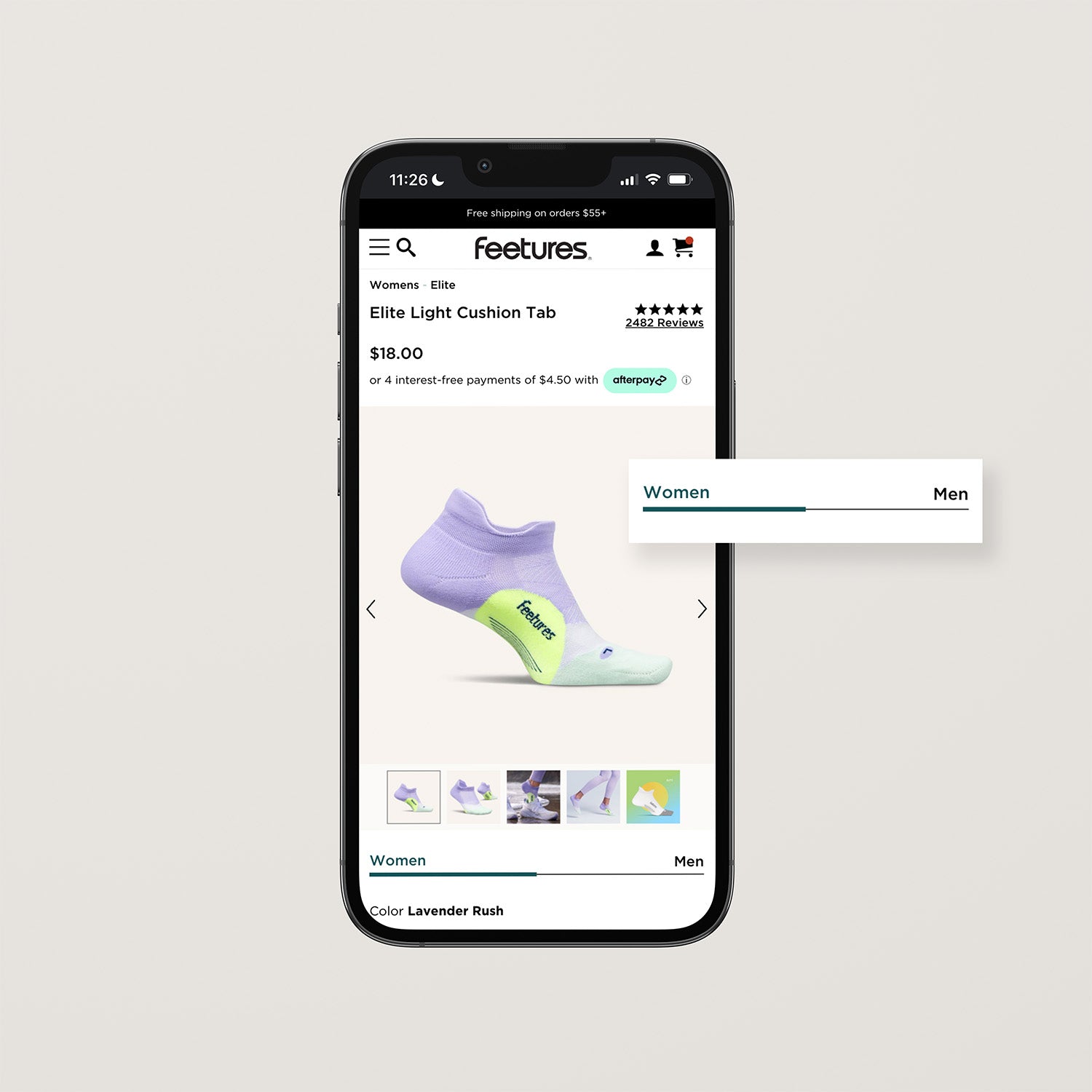 The Feetures team aimed to differentiate the shopping experience for men and women without creating separate product listings by gender. We implemented a feature that dynamically displays default product colors based on whether the customer is browsing the men's or women's collections. On the product pages, customers can also toggle between men's and women's tabs to view color variants available in their specific size range, giving the team greater merchandising control.