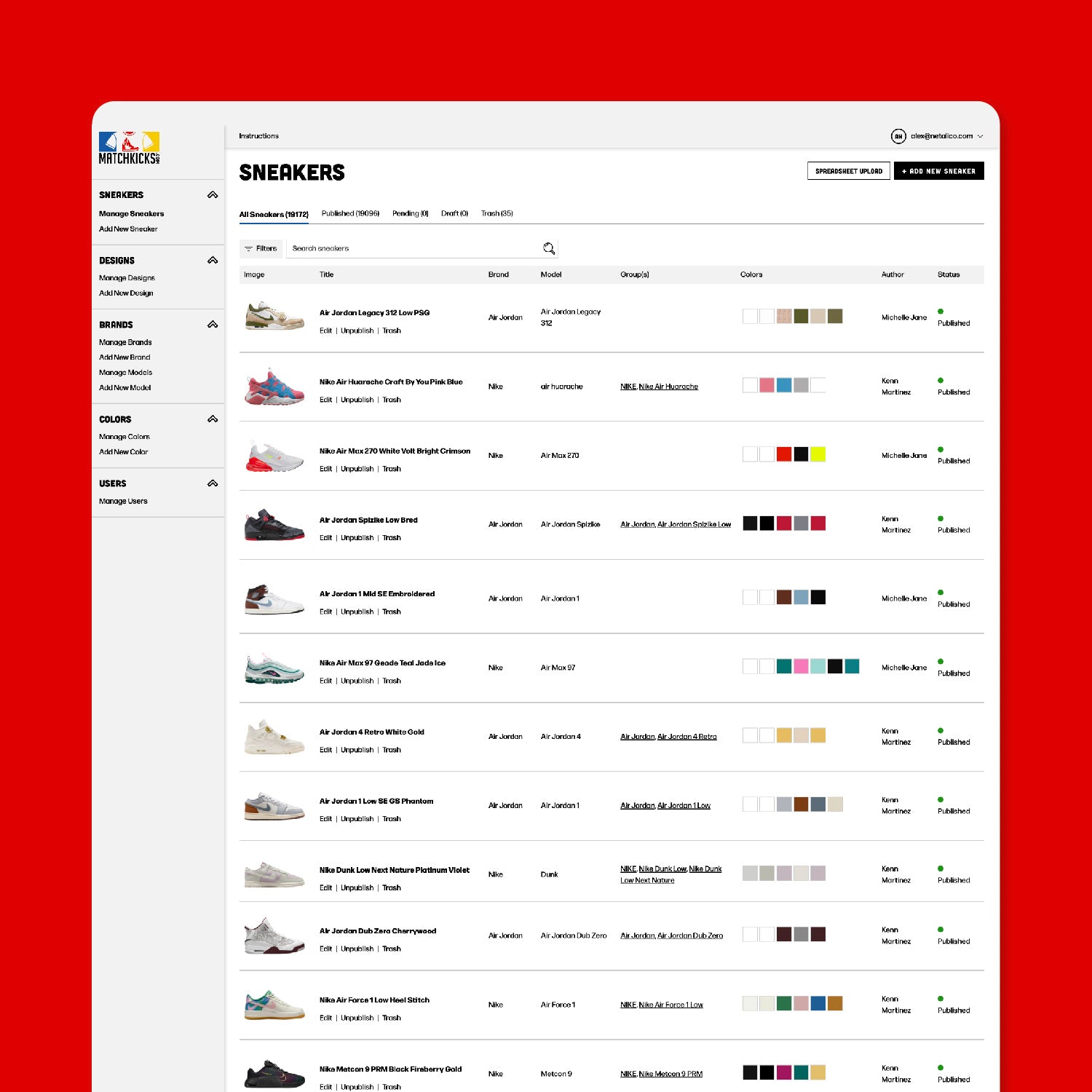 With so many possible color combinations, Match Kicks would easily outstrip Shopify's product limits. To circumvent these limits, we built a custom Laravel-based backend for the site that matches the databases of sneakers, designs, and t-shirt colors and other products to create each product in Shopify in real time as it's requested by a shopper. Plus, we designed and built a custom UI to manage these databases, so that the Match Kicks team could more easily add newly released sneakers to the site and eventually allow designers to upload their own t-shirt designs.