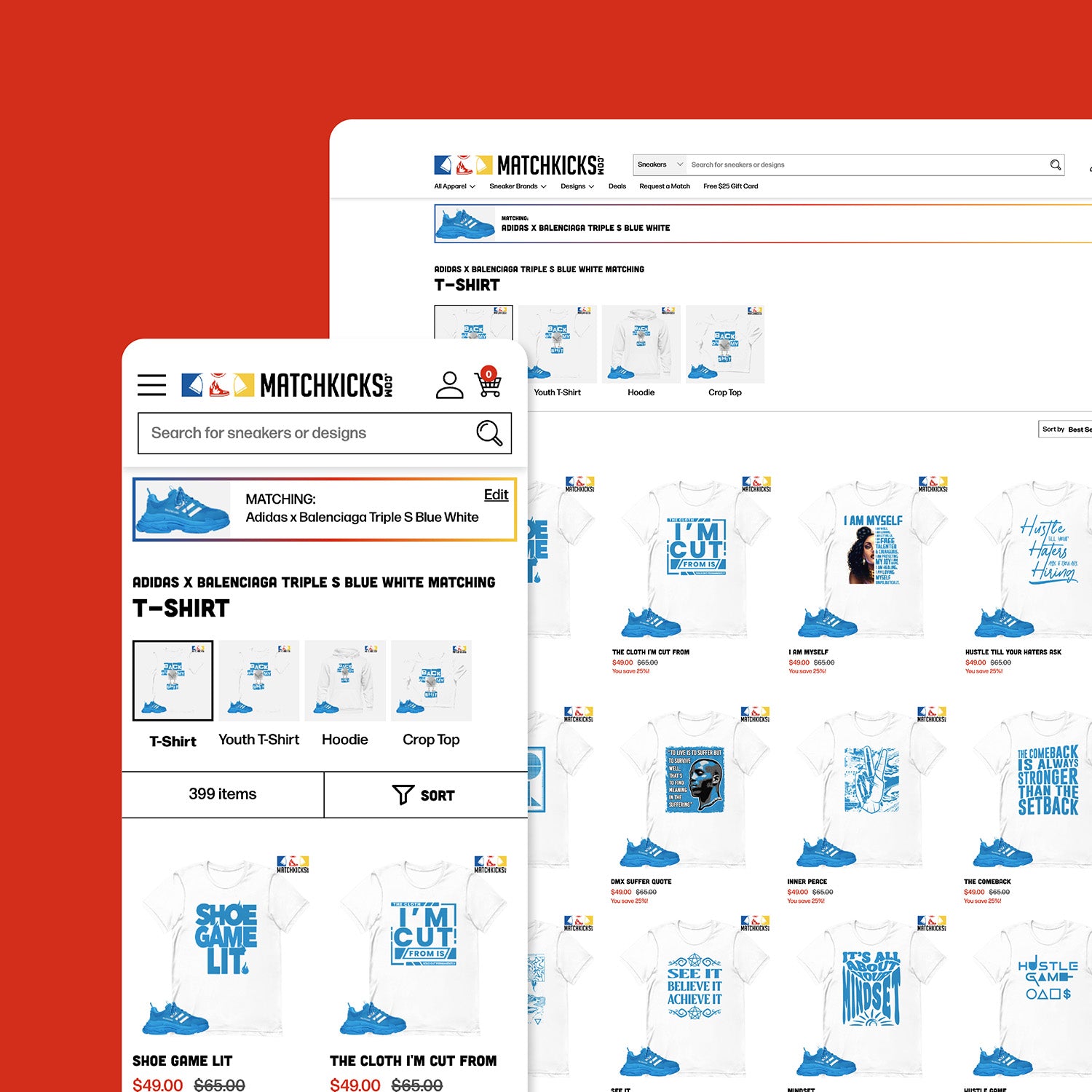 Starting with a site architecture master plan, we custom designed a customer flow through a "sneaker matcher" tool that let visitors find their favorite pair of sneakers from anywhere on the site and color match to t-shirts, hoodies, crop tops, socks, bags, and more. Visitors can start with a shoe and see designs color-matched to it, or start with a design and then pick the shoe they would want to wear with it.