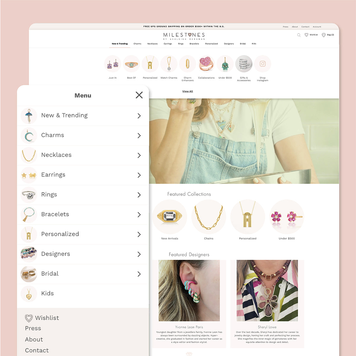 We've designed and built multiple projects over the years to improve product browsing on site. A custom navigation with customizable images entices users to explore, and custom badges showcase new, trending, popular, and Ashleigh's Faves, all to draw in visitors and help them find a place to start finding the jewels that speak to them. The integration of Rebuy sitewide personalizes the shopping experience and improves AOV.
