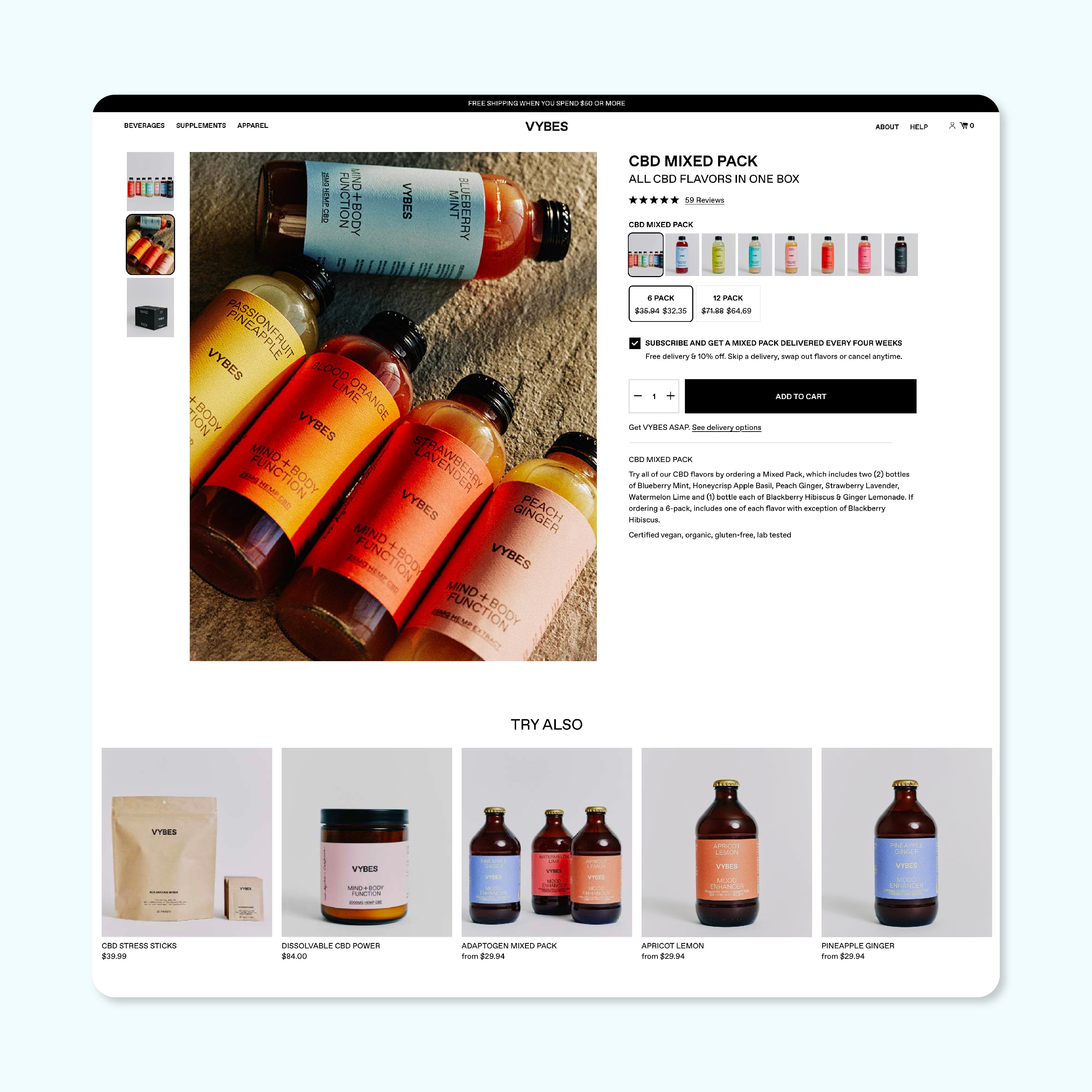 We have designed and implemented a custom navigation, custom drawer cart, and new category and product templates for VYBES. Now, on their product pages, a user can easily swap between different flavors, instead of needing to navigate to each individually. Users can also quickly add a product to cart from any device on collection pages, making re-ordering easy and frictionless for their strong audience of return customers. We also built out Rebuy across their site, allowing for quick and easy cross-sells sitewide.